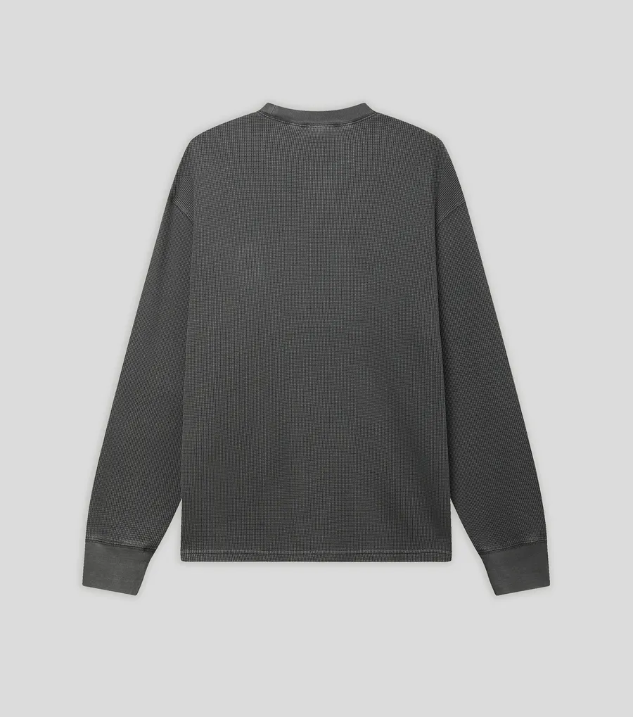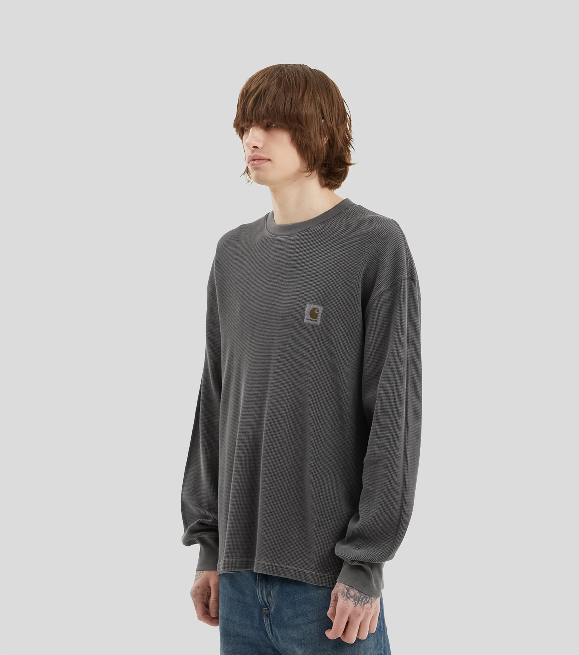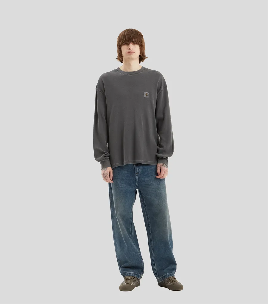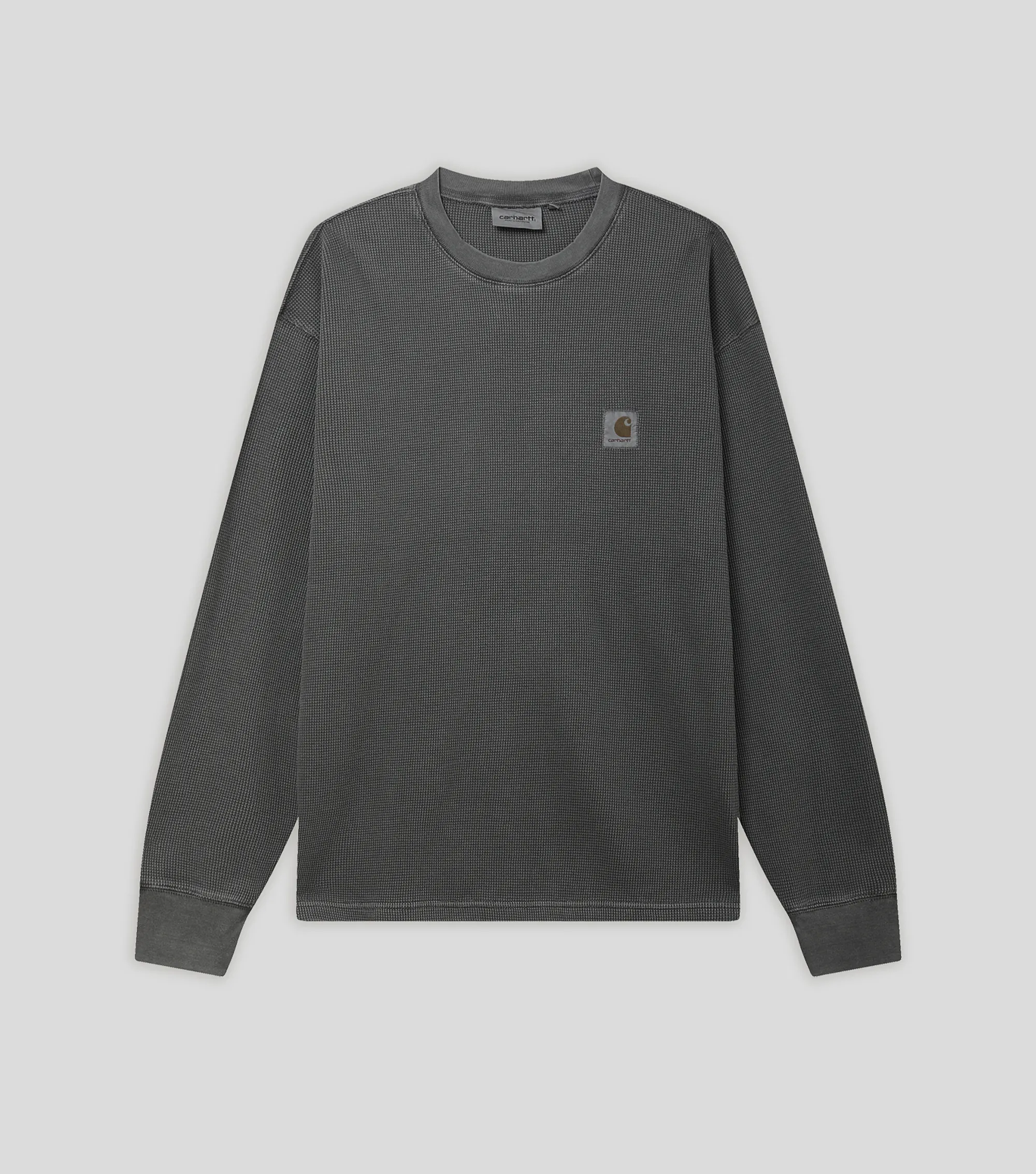 Лонгслив Carhartt WIP изготовлен из хлопкового вафельного трикотажа и окрашен в готовом виде, что придает изделию сложный, насыщенный оттенок.