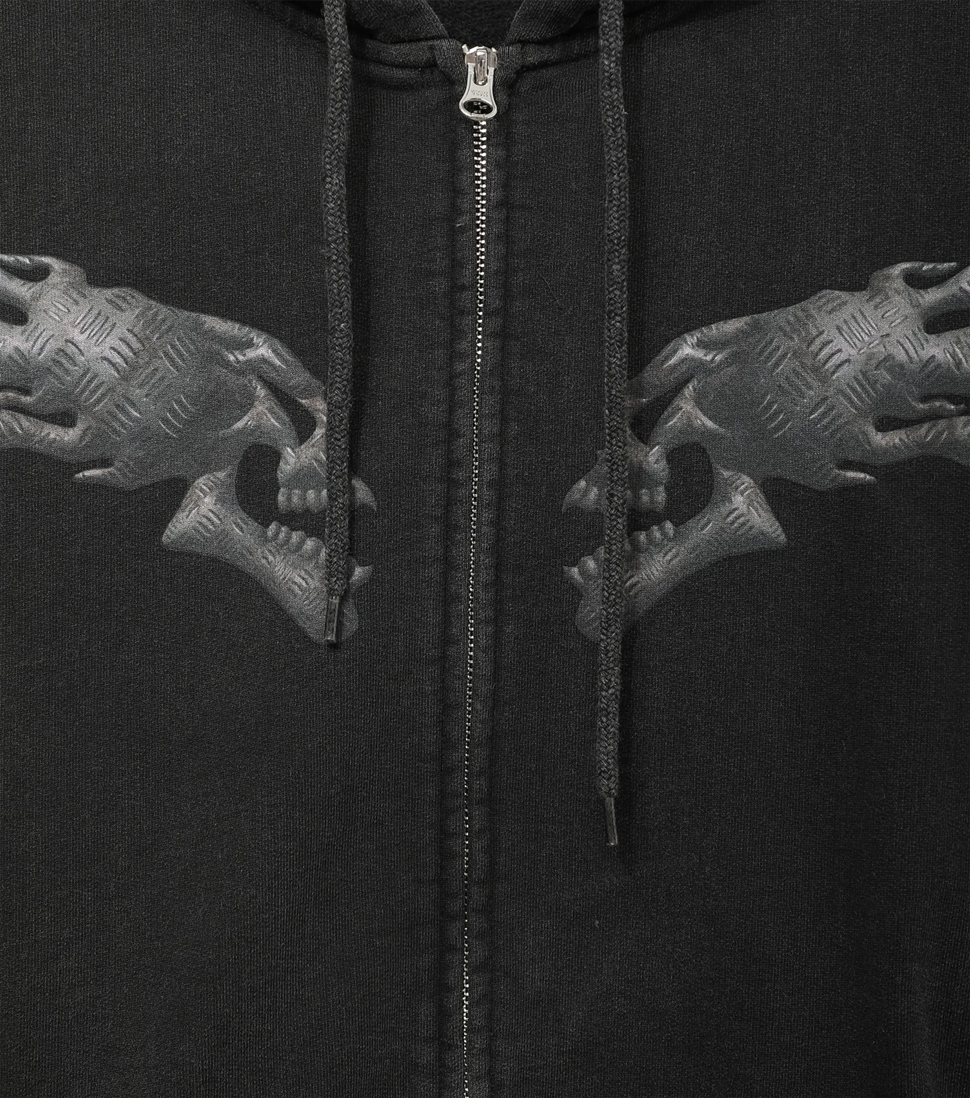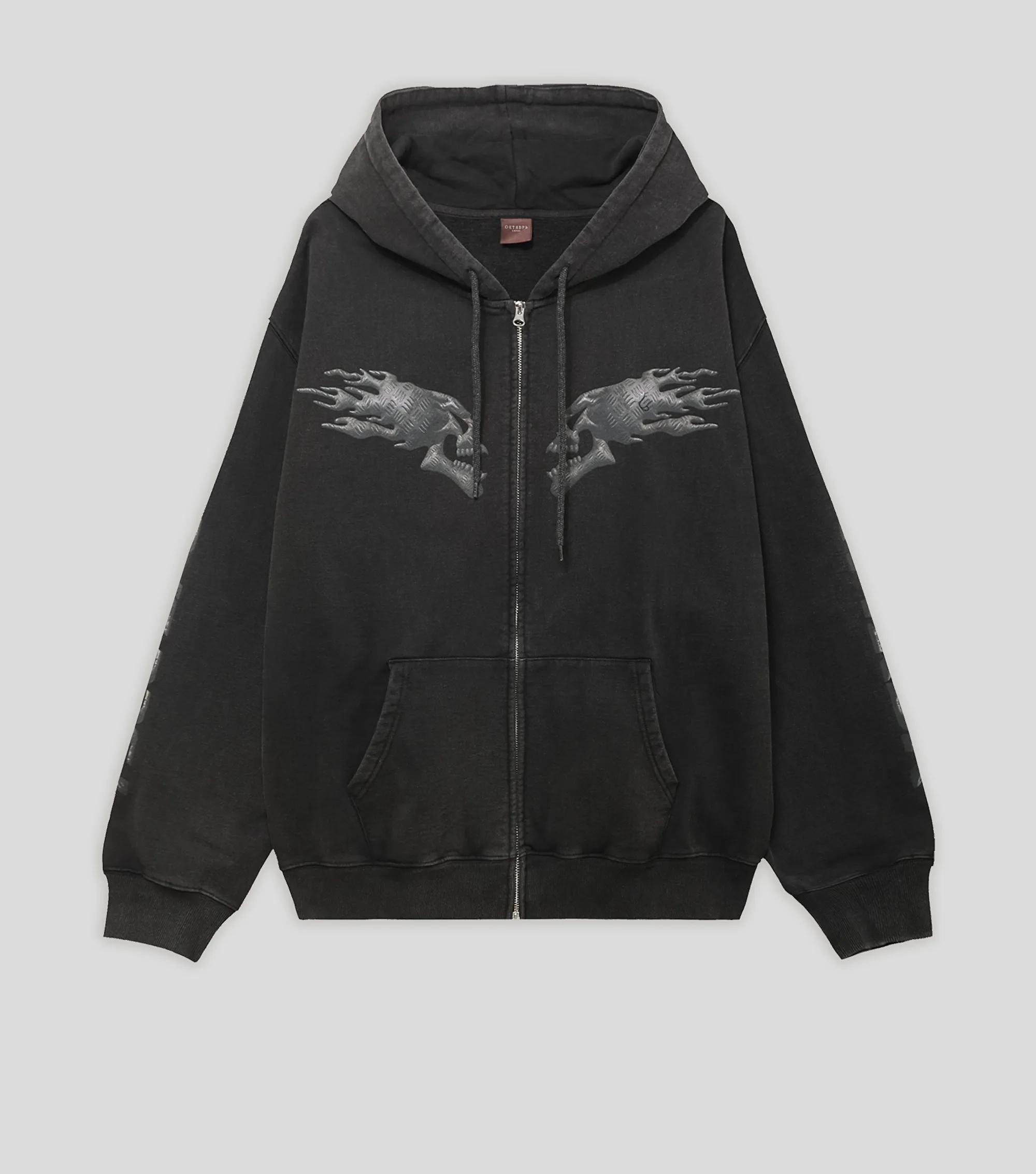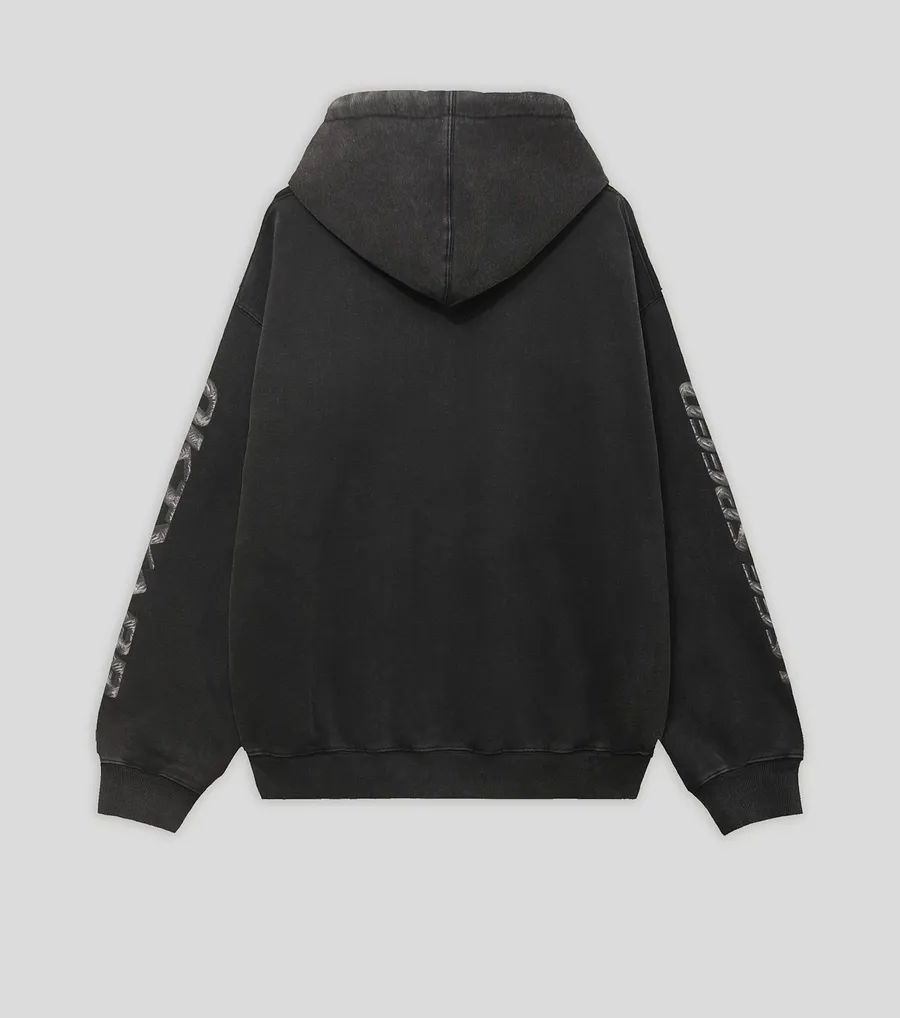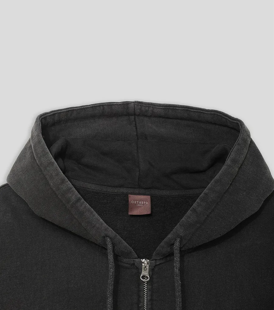 Худи на молнии из плотного хлопкового футера 450 г/м². Свободный крой, регулируемый объемный капюшон на кулиске, накладные карманы. Обработка Hard Washing для дополнительной мягкости и неоднородного цвета. Принт Октябрь на груди.