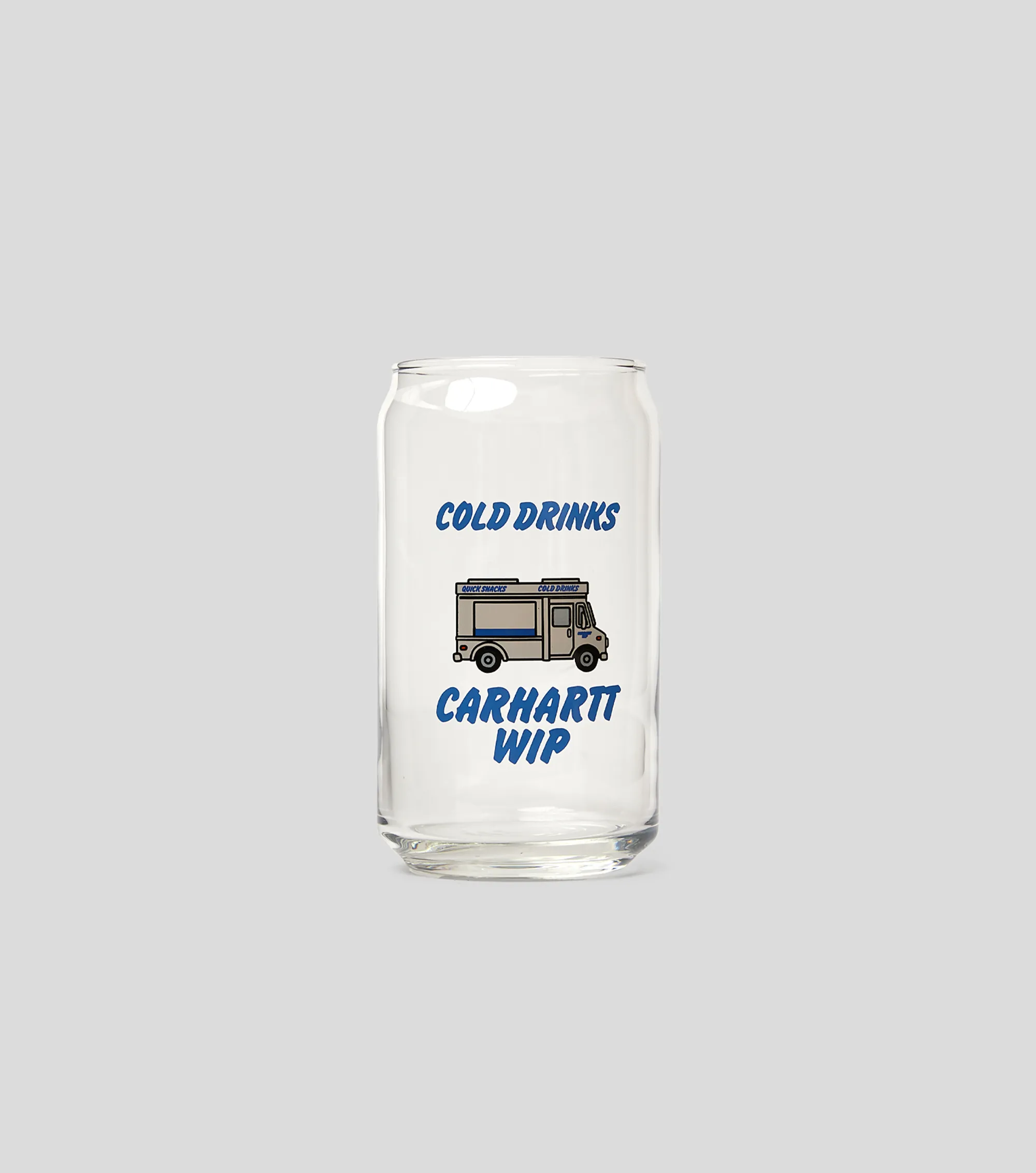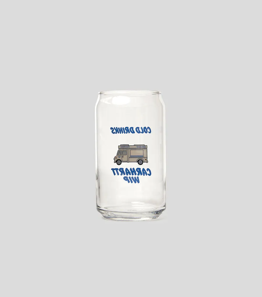 Стакан Carhartt WIP — оригинальный аксессуар для дома и отдыха, выполненный в форме банки газированного напитка. Модель изготовлена из стекла и украшена графическим принтом.